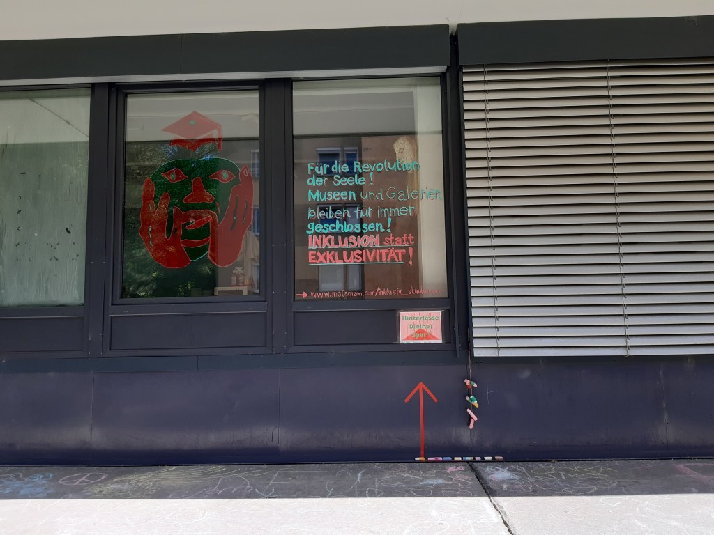 Die Arbeit hat während dem 1. Lockdown stattgefunden. Die Pandemie und die Tatsache, dass alles gesperrt war, hat dazu geführt, dass die Ausstellung an den Fenstern der Universität Mozarteum konzipiert wurde. So konnte ich die Empfindung hinter meiner Arbeit gut ausdrücken. Das Gefühl, hinter einer Scheibe zu stehen und so laut zu schreien wie ich kann. Ich klopfe und hämmere gegen die Wand. Es dröhnt in meinen Ohren. Aber dennoch hört mich niemand.
