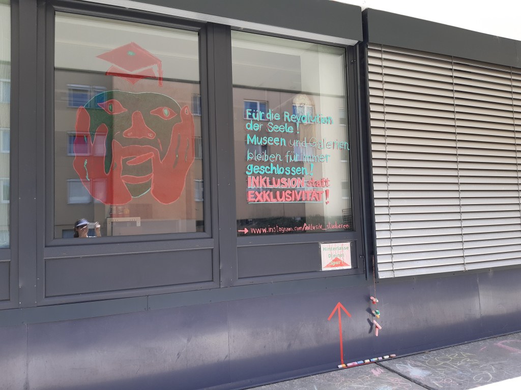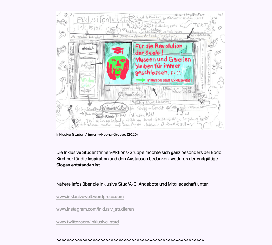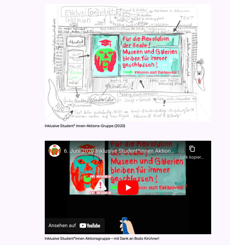 Seit 2019 verbinde ich Kunst mit Disability-Aktivismus, Empowerment und sozialer Tätigkeit. Durch die Arbeit „Inklusive Studentinnen-Aktions-Gruppe“, habe ich Interaktions-Räume kreiert, die sich innerhalb von verschiedenen Disziplinen und Realitäten neu vermischen. Ausgangspunkt waren intensive (wissenschaftliche) Recherchen und (eigene) Texte, Recherchen in meiner Umgebung und der Austausch mit anderen Menschen, die von psychosozialer Behinderung betroffen sind, um ihre Erfahrungen und Sichtweisen zu teilen. Es wurde in weiterer Folge eine aktivistische Empowerment-Plattform für betroffene Student*innen gegründet, weil diese Studierenden sehr oft die Universität verlassen (müssen), ihr Studium abbrechen (müssen), und ihr Ich stets verbergen (müssen). Ich war fortlaufend im Austausch mit anderen Betroffenen. Kooperiert wurde z.B. mit Vereinen in Österreich und Deutschland, die sich für die Rechte von Menschen mit psychosozialen Behinderungen einsetzen und auch mit Professor*innen der Inklusiven Pädagogik an der PH Salzburg.