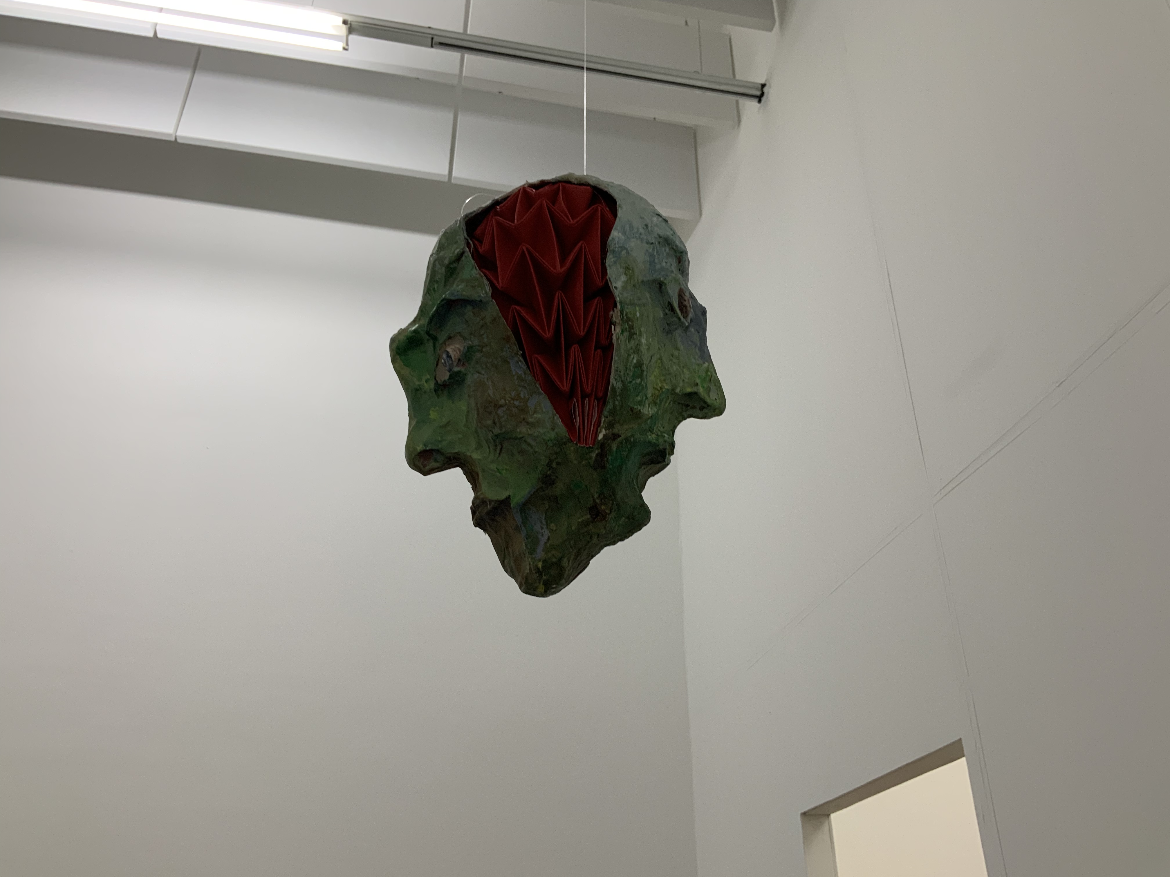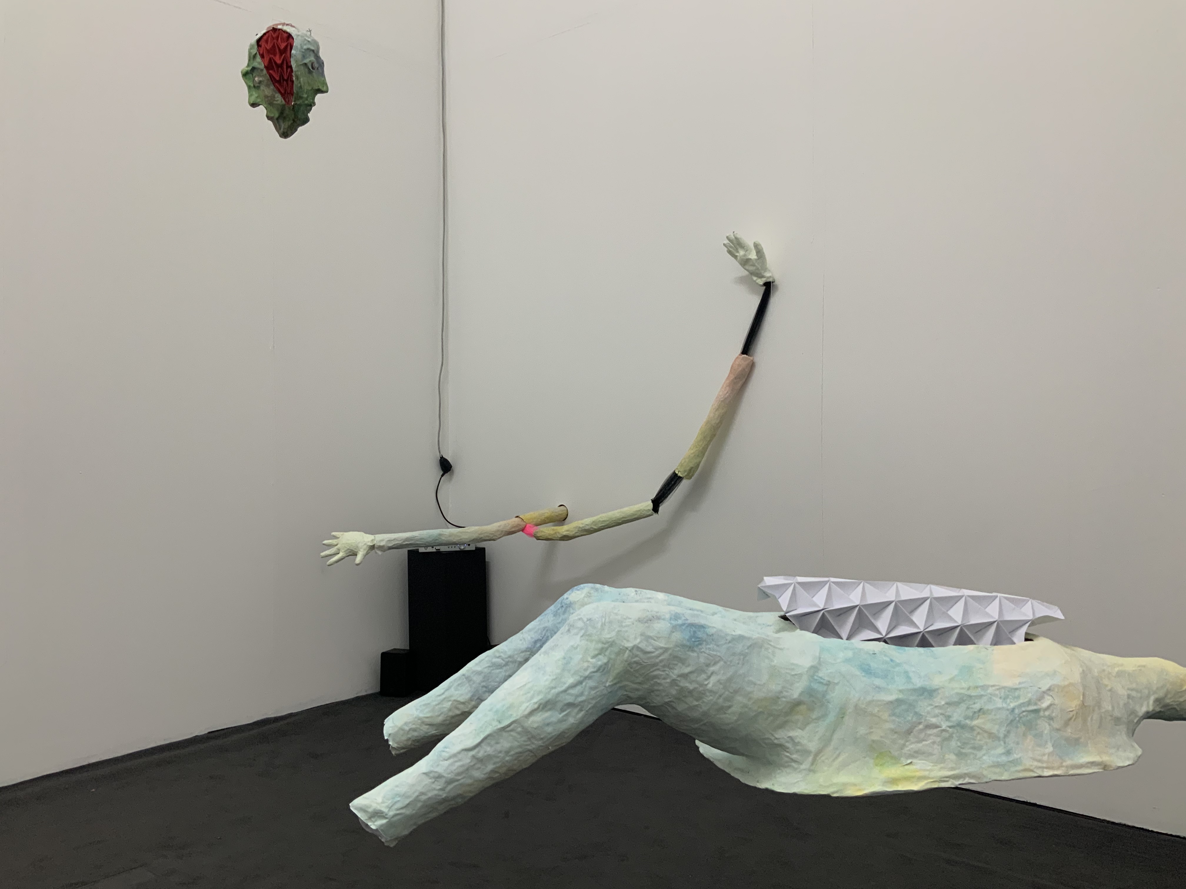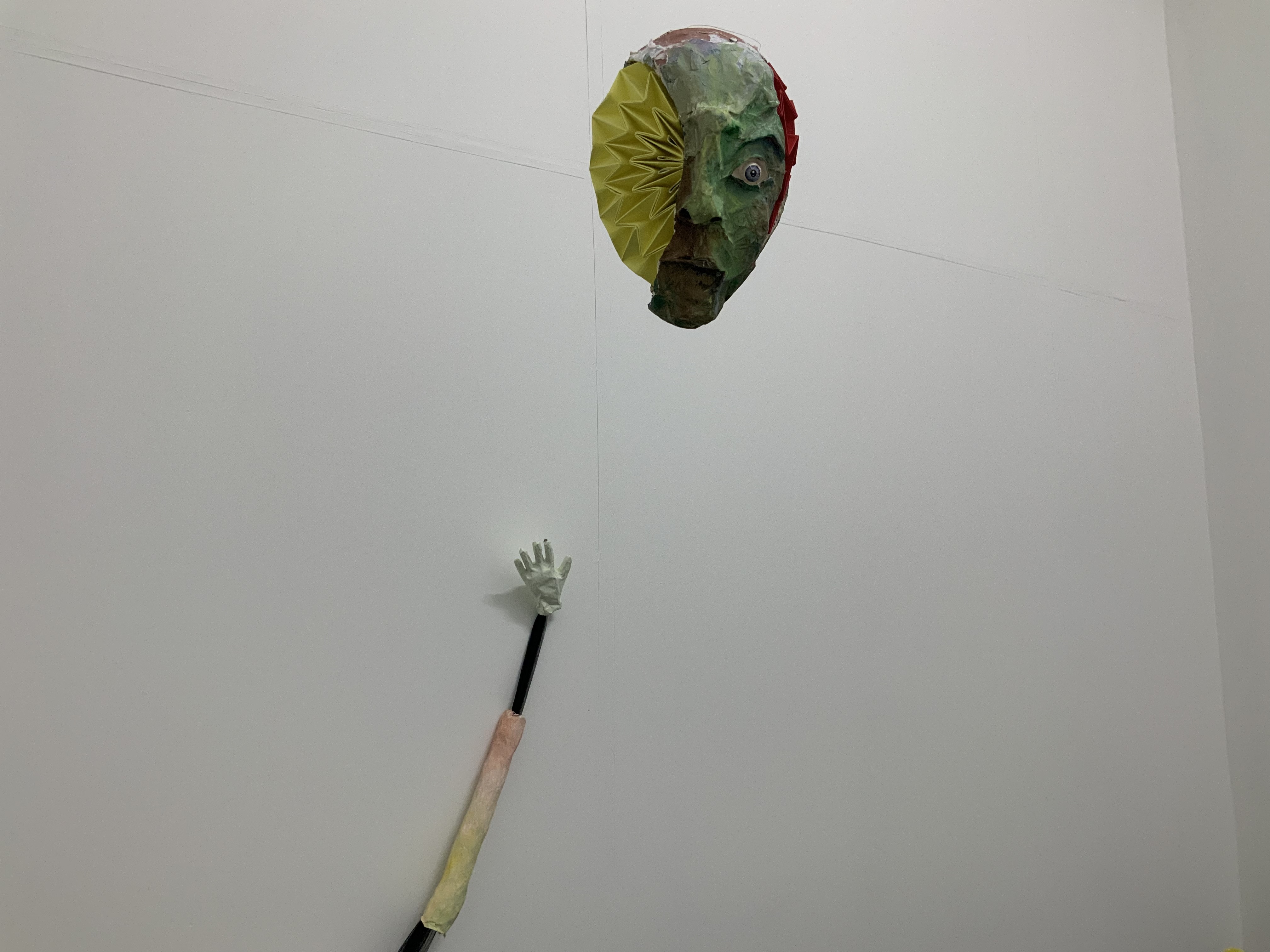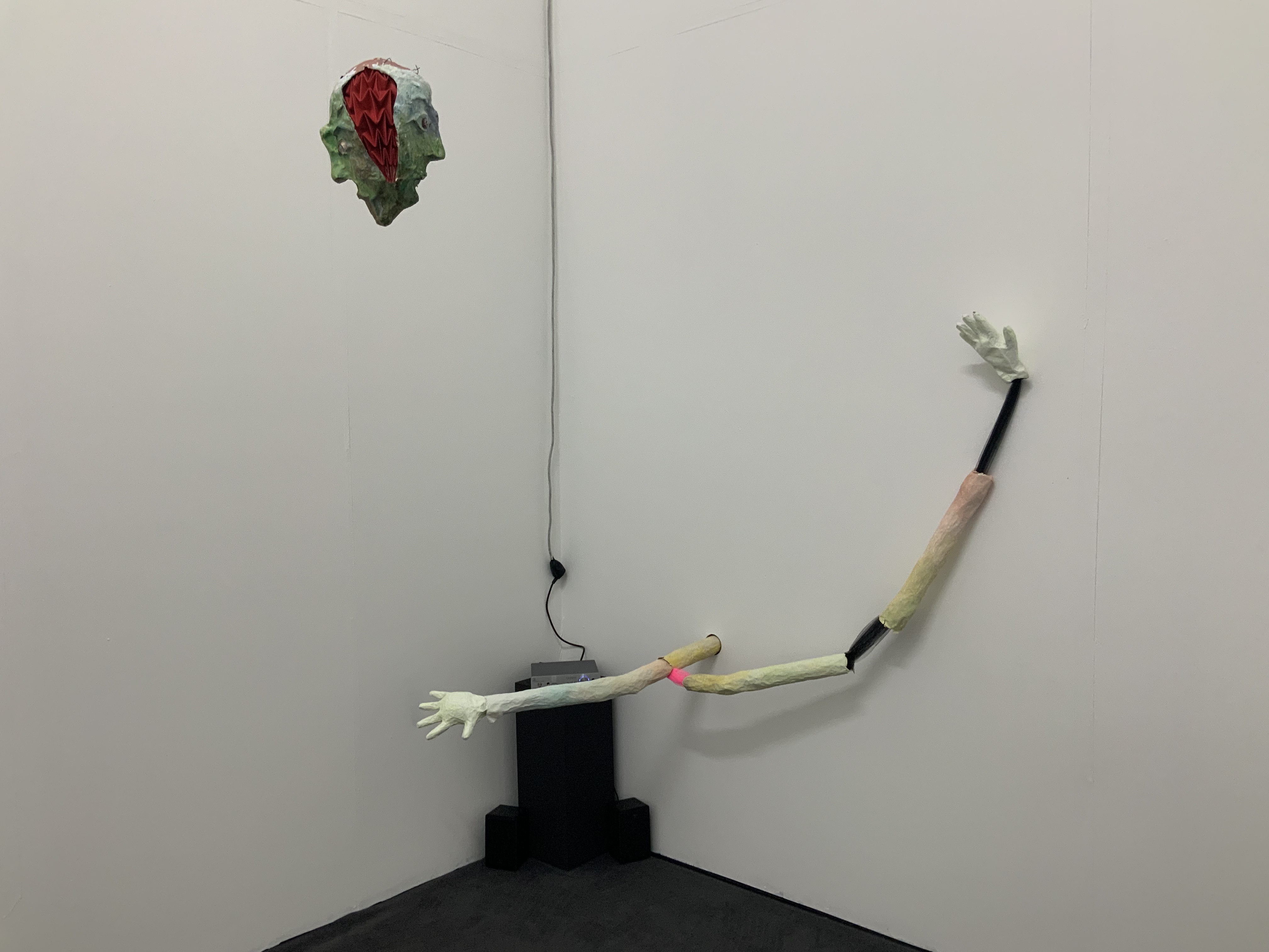 Erster Ausgangspunkt der Installation war, dass ich einen Körper für meine vor längerer Zeit gefertigten Köpfe, die gleichzeitig auch Masken sind, kreieren wollte.