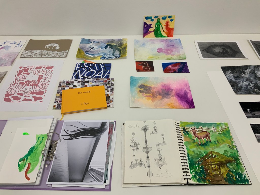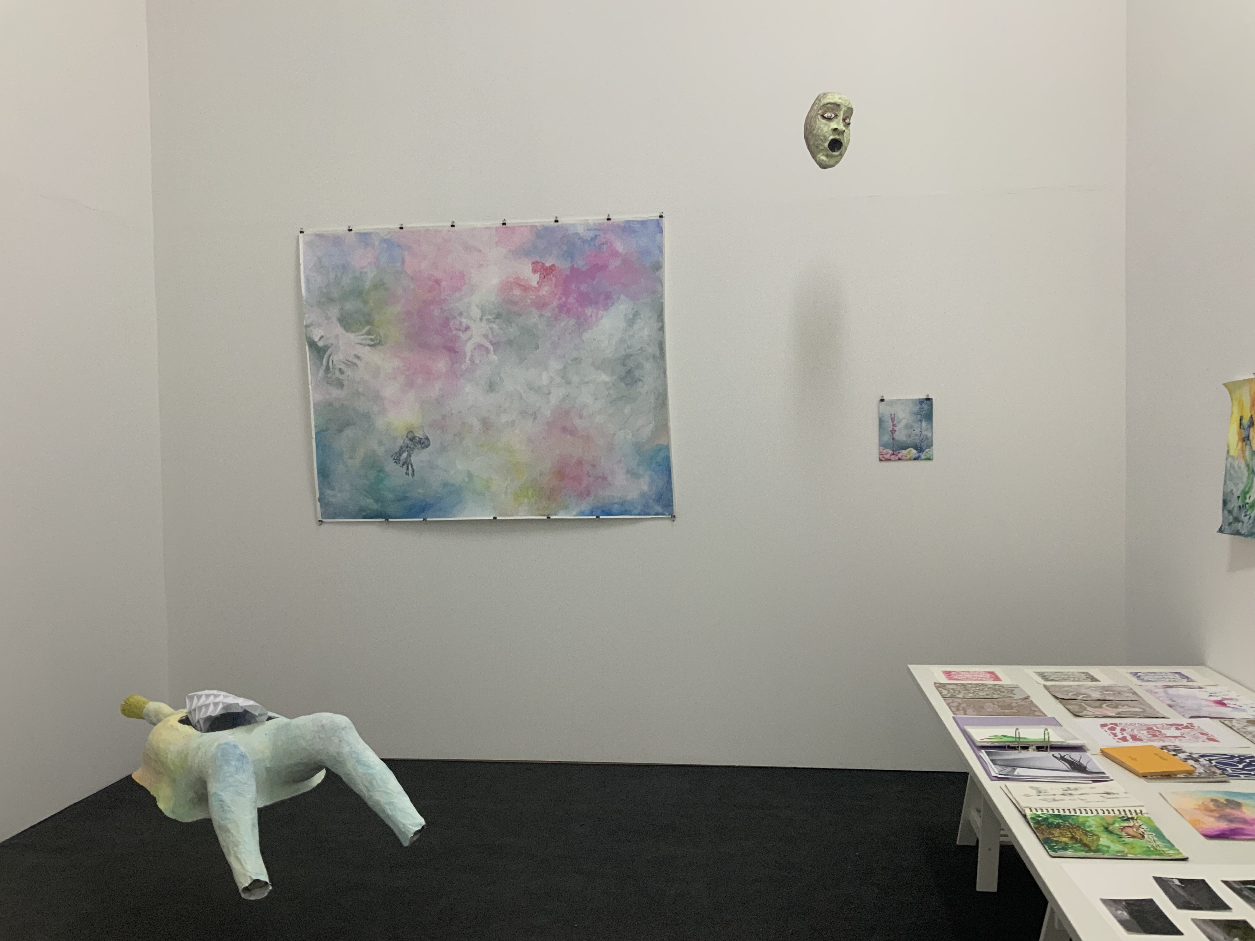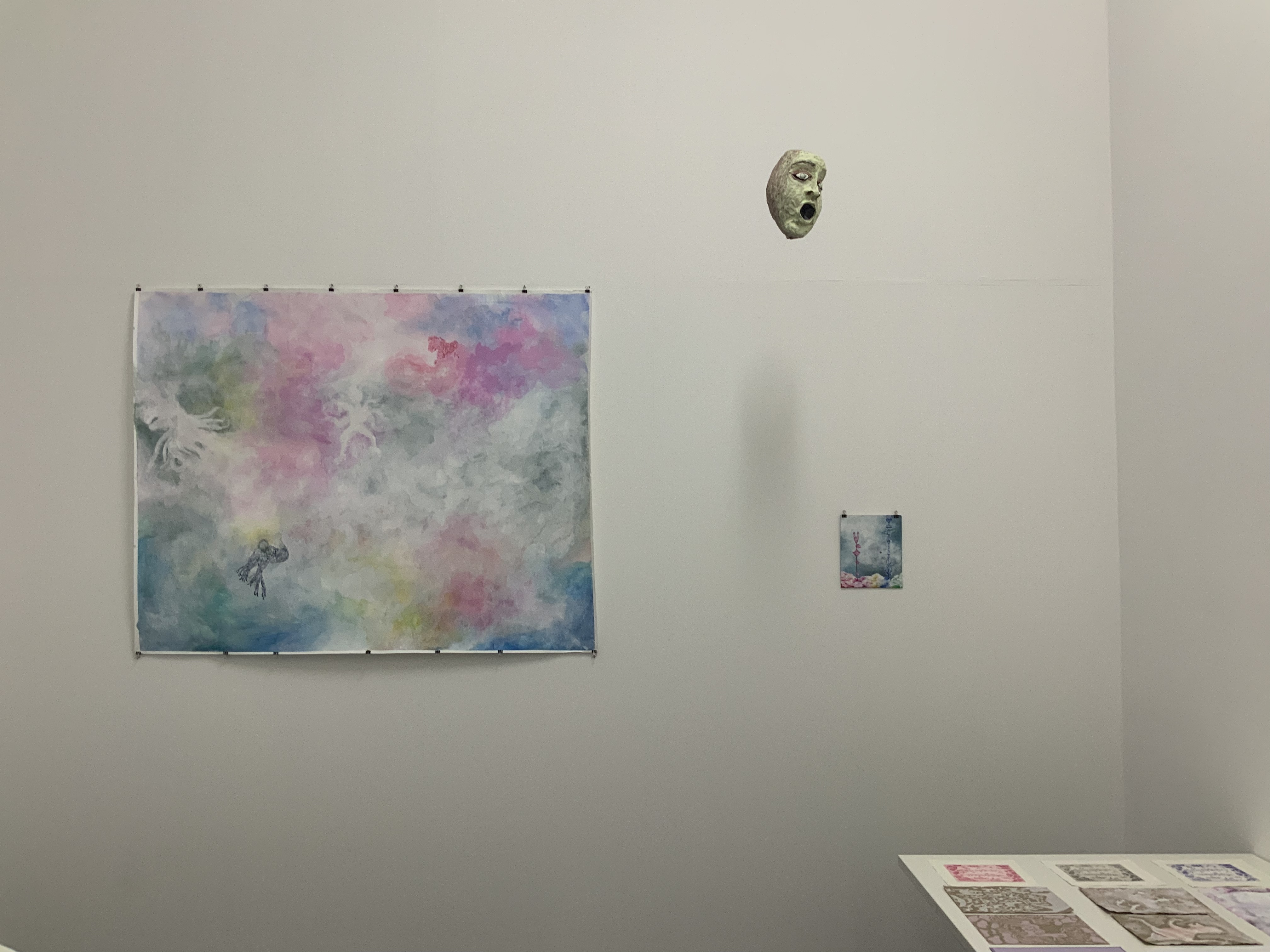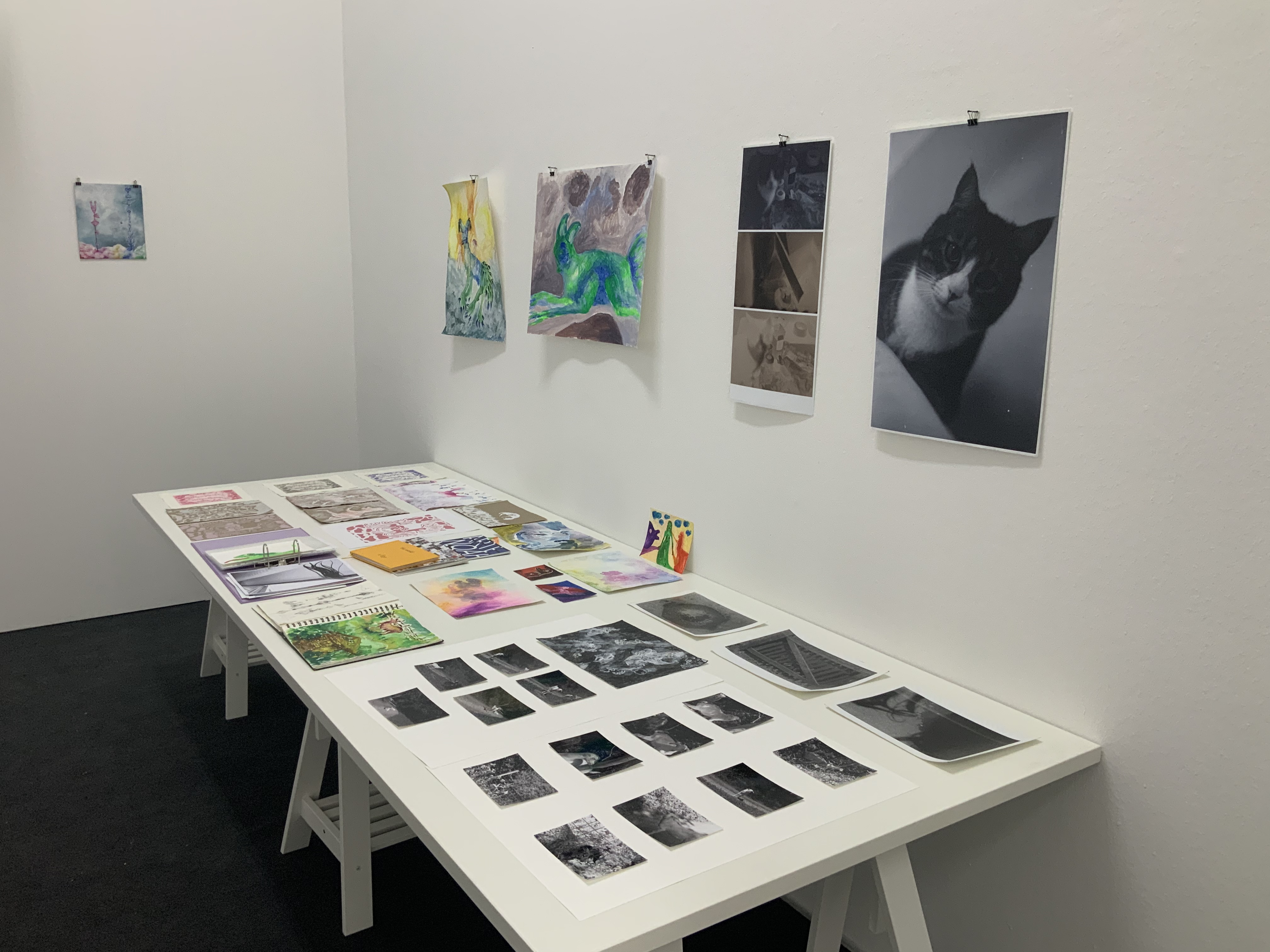 | Sound: Schreigesang, Tonaufnahmen von unterschiedlichen Orten und Geräuschen Mein Weißpfötchen, Serie von 3 analogen Fotografien, je 30,4×23,9 cm, 1 analoge Fotografie, 61×45 cm Wiedergeburt, Serie von 13 analogen Fotografien, je 10,5×14,8 cm Himmelsboden, 3 Analoge Fotografien, je 18,5×27,9 cm Skulpturen aus Pappmaché (Köpfe, Körper, Arme und Hände), Falte aus Papier in Köpfen und im Körper von Jonathan Wendt this world is Ego No longer, Künstlerbuch Skizzenbuch mit Malereien und Zeichnungen, je 28×23 cm: Piki, Aquarell auf Papier und Bleistift auf Papier, 28×32 cm Mappe mit Reproduktionen von Malereien und Grafiken von 1997-2008 O.T., Acryl auf Papier, 153×193,5 cm Entrückt, Acryl auf Leinen, 25×30 cm Flucht vor der Coronawolke, Acryl auf Papier, 24x32cm Strupsi, Acryl auf Papier, 65×50 cm Offenbarung, Aquarell auf Papier, 29,7×42 cm Hilf mir!, Aquarell auf Papier, 14,8x21cm Fliegende Tiere, Serie von 3 Aquarellen auf Papier, je 29,5×20,9 cm Wir kommen, Aquarell auf Papier, 65×50 cm Unsichtbar, Aquarell auf Papier, 10,5×14,8 cm Nachtseelen, 3 Aquarelle auf Papier, je 24×32 cm nach dem Tod wird wieder alles wie früher, oder?, Serie von 3 Kaltnadelradierungen auf Papier, je 25×26,5 cm Tirlis, Serie von 2 Linolschnitten auf Papier, je 29,5×20,9 cm, Linolschnitt auf Papier, 29,7×42 cm Vogi, Druckgrafik aus verschiedenen Stempeln (1999), 10,5×10,1 cm |