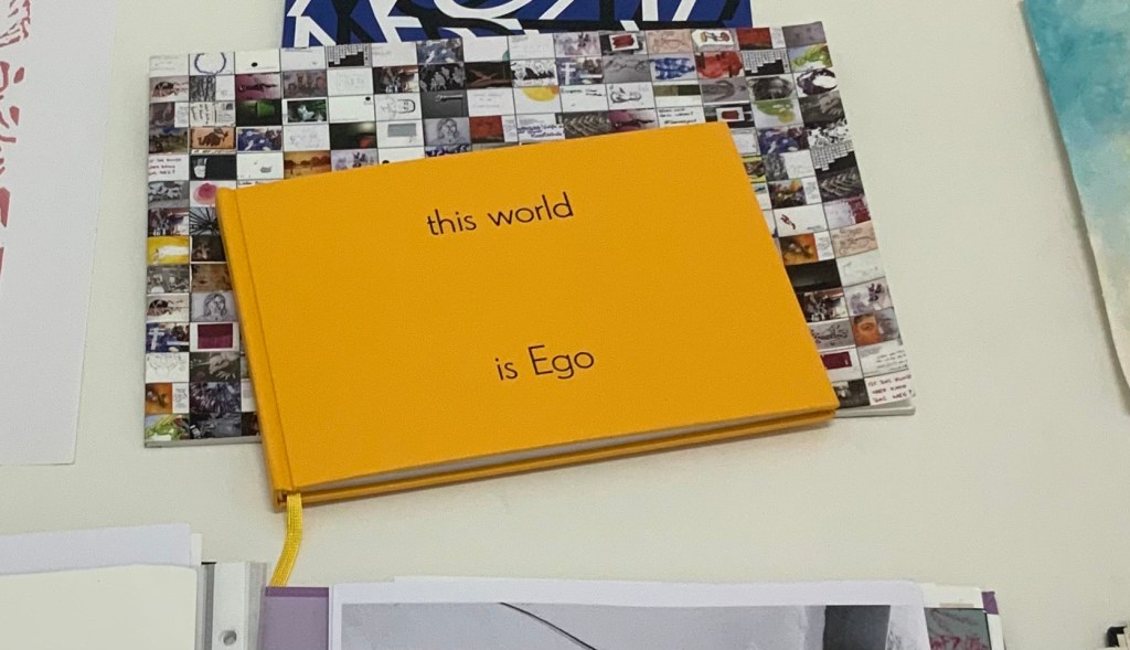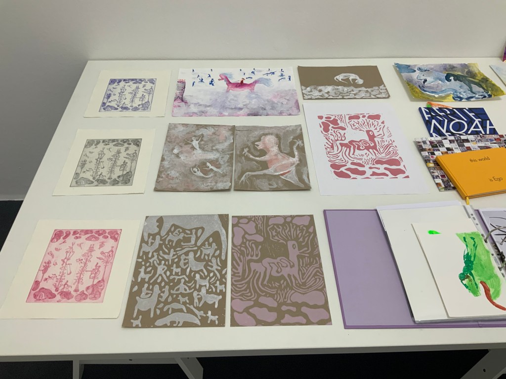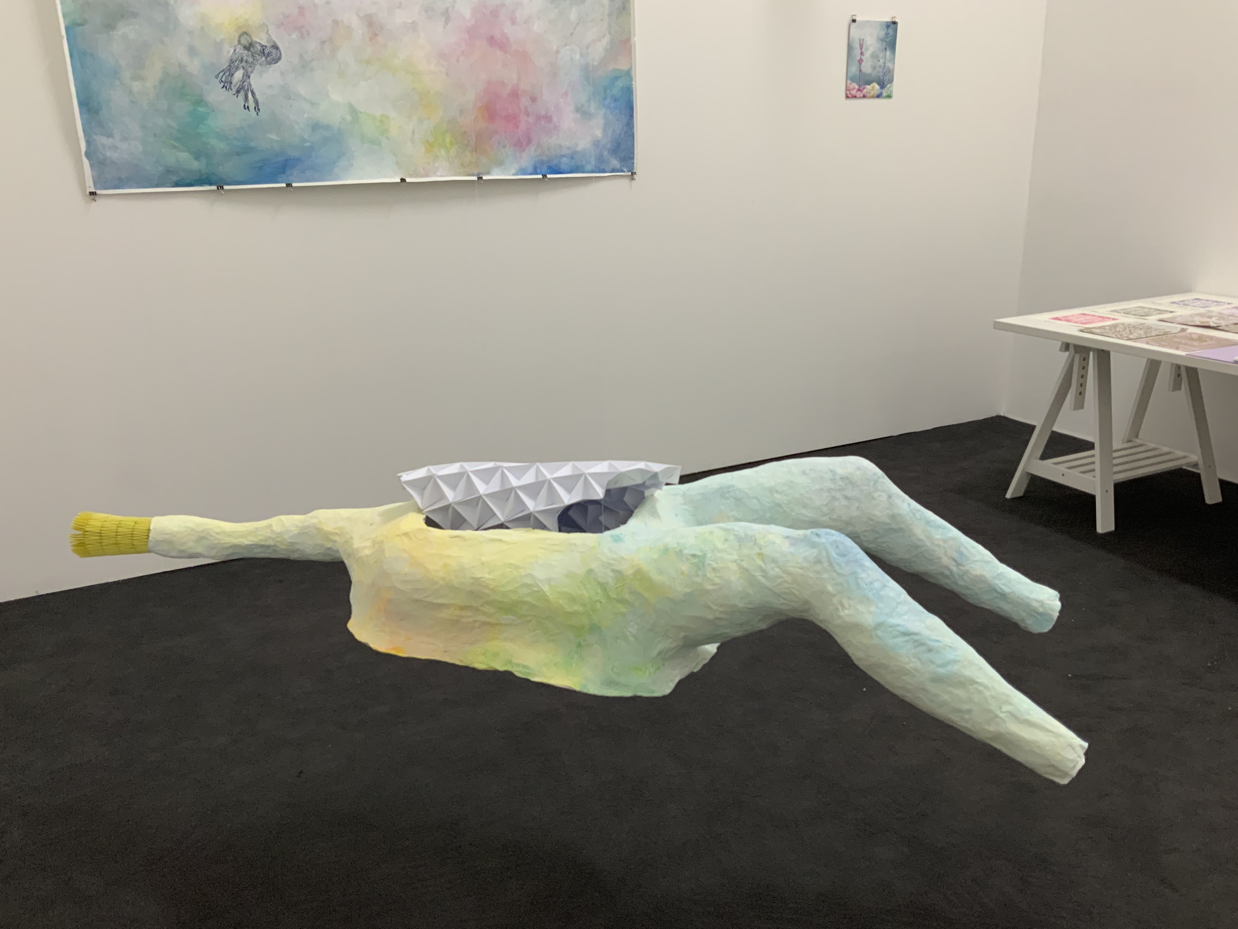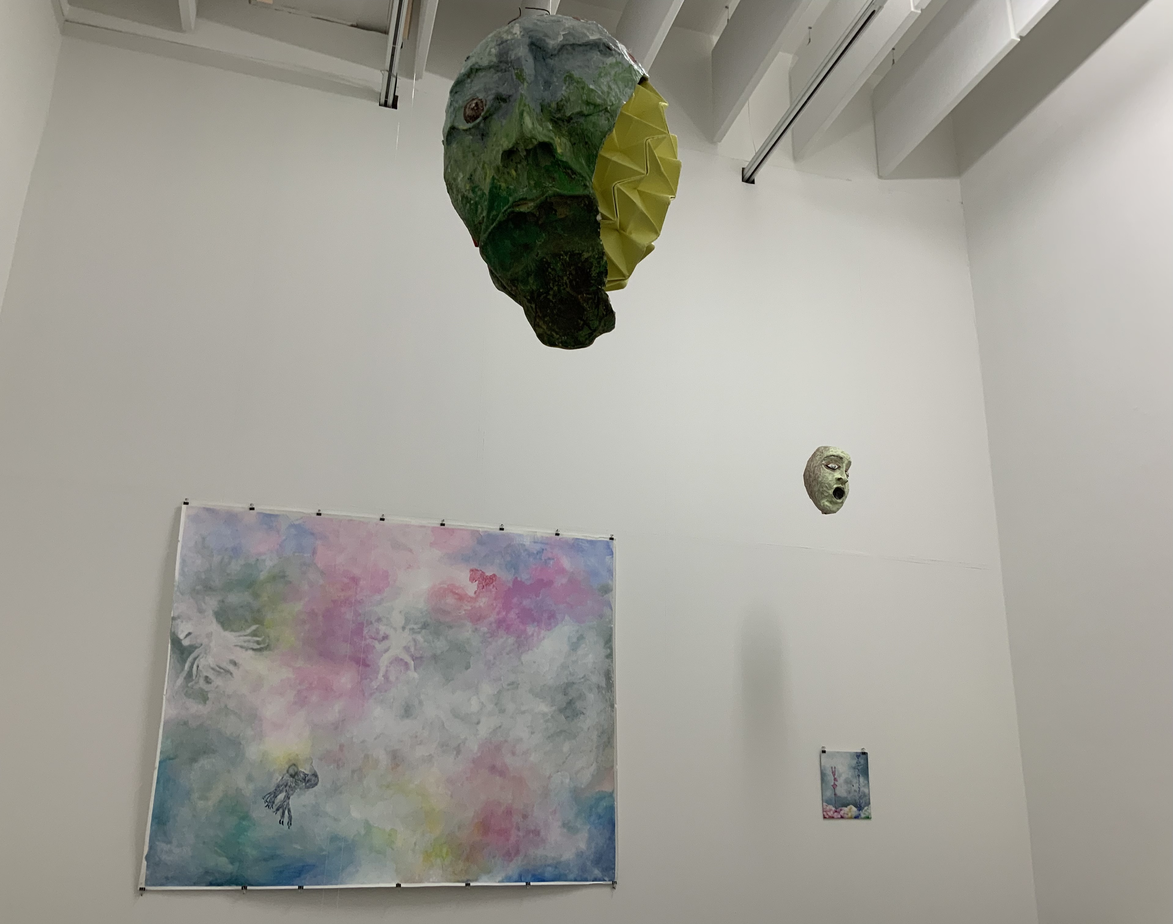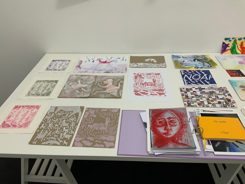 | Sound: Schreigesang, Tonaufnahmen von unterschiedlichen Orten und Geräuschen Mein Weißpfötchen, Serie von 3 analogen Fotografien, je 30,4×23,9 cm, 1 analoge Fotografie, 61×45 cm Wiedergeburt, Serie von 13 analogen Fotografien, je 10,5×14,8 cm Himmelsboden, 3 Analoge Fotografien, je 18,5×27,9 cm Skulpturen aus Pappmaché (Köpfe, Körper, Arme und Hände), Falte aus Papier in Köpfen und im Körper von Jonathan Wendt this world is Ego No longer, Künstlerbuch Skizzenbuch mit Malereien und Zeichnungen, je 28×23 cm: Piki, Aquarell auf Papier und Bleistift auf Papier, 28×32 cm Mappe mit Reproduktionen von Malereien und Grafiken von 1997-2008 O.T., Acryl auf Papier, 153×193,5 cm Entrückt, Acryl auf Leinen, 25×30 cm Flucht vor der Coronawolke, Acryl auf Papier, 24x32cm Strupsi, Acryl auf Papier, 65×50 cm Offenbarung, Aquarell auf Papier, 29,7×42 cm Hilf mir!, Aquarell auf Papier, 14,8x21cm Fliegende Tiere, Serie von 3 Aquarellen auf Papier, je 29,5×20,9 cm Wir kommen, Aquarell auf Papier, 65×50 cm Unsichtbar, Aquarell auf Papier, 10,5×14,8 cm Nachtseelen, 3 Aquarelle auf Papier, je 24×32 cm nach dem Tod wird wieder alles wie früher, oder?, Serie von 3 Kaltnadelradierungen auf Papier, je 25×26,5 cm Tirlis, Serie von 2 Linolschnitten auf Papier, je 29,5×20,9 cm, Linolschnitt auf Papier, 29,7×42 cm Vogi, Druckgrafik aus verschiedenen Stempeln (1999), 10,5×10,1 cm |