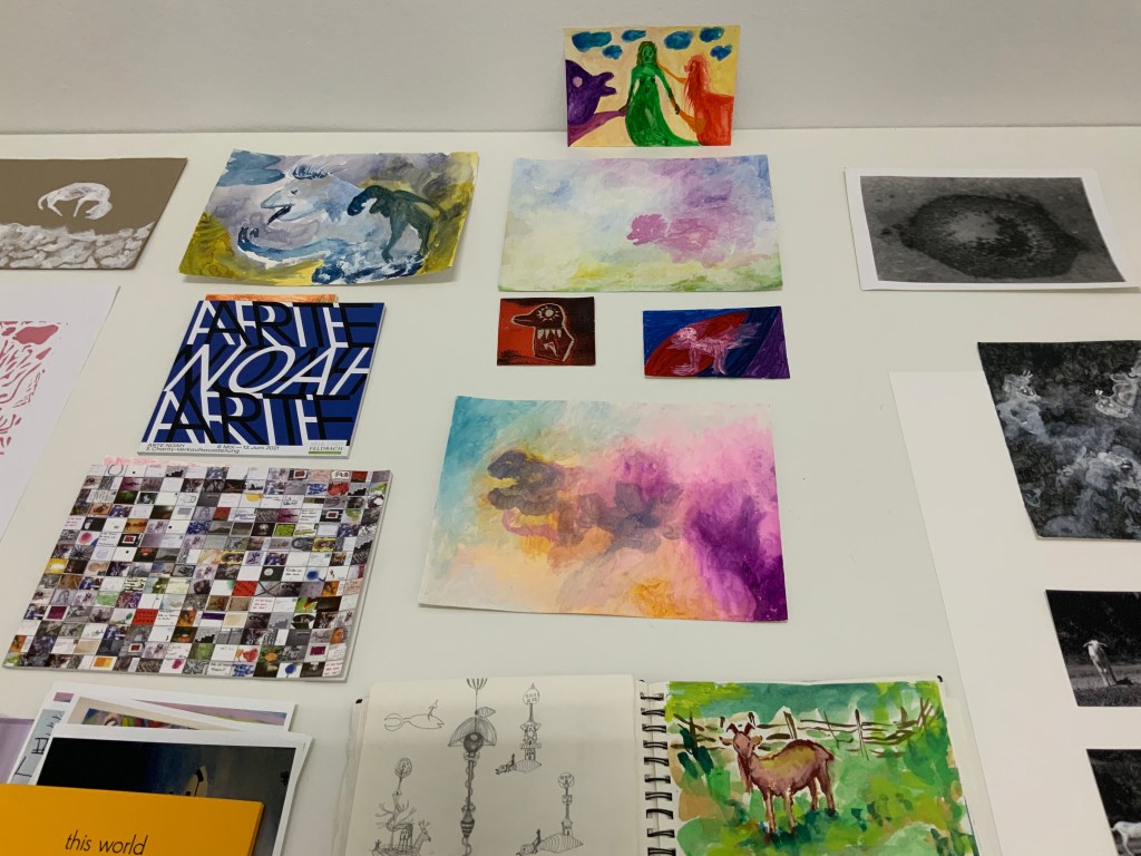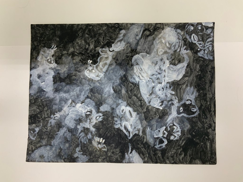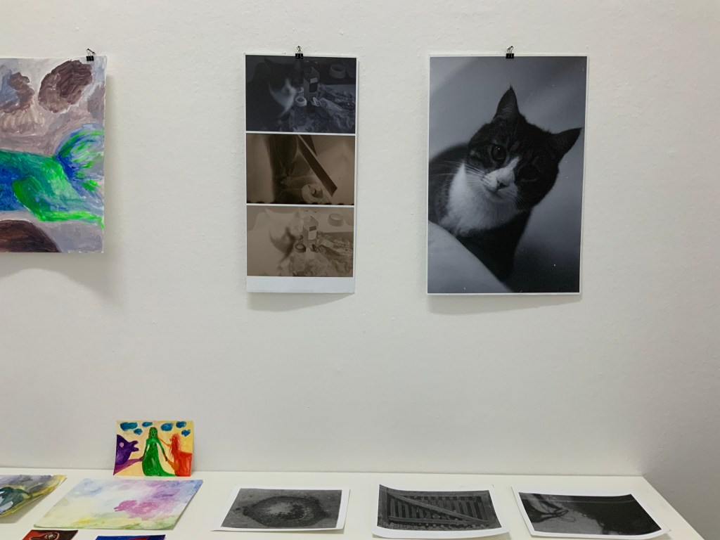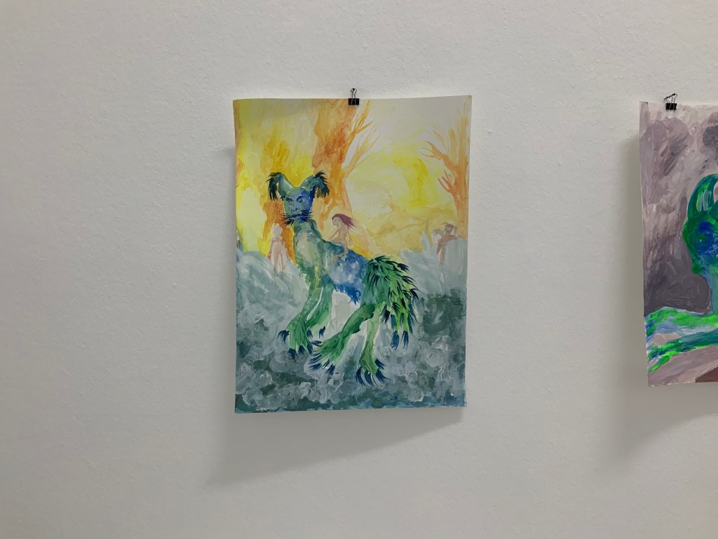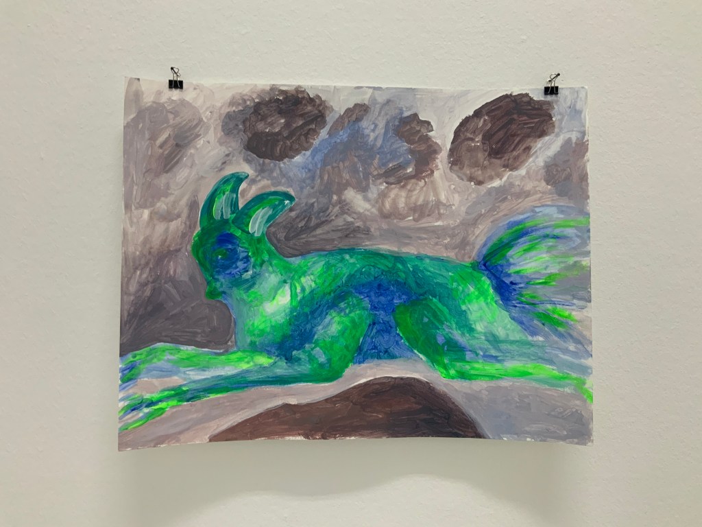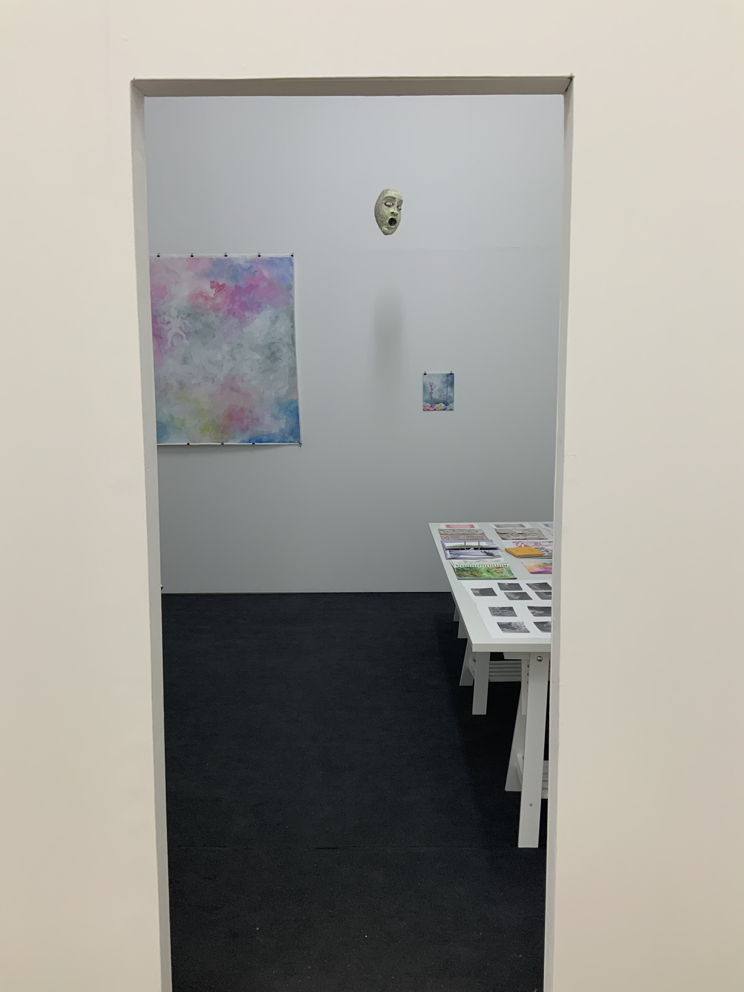 Im weiteren Zusammenspiel mit Sound, der u.a. aus meinem Schreigesang, Wasser- und Windgeräuschen besteht, sowie den Malereien, Grafiken und analogen Fotografien, war es meine Intention in der Arbeit „nach dem Tod wird wieder alles wie früher, oder?“ meine eigene Verletzlichkeit und gleichzeitig die komplexe, mich am Leben erhaltende Tier-, Traum- und Seelenwelt, auszudrücken.