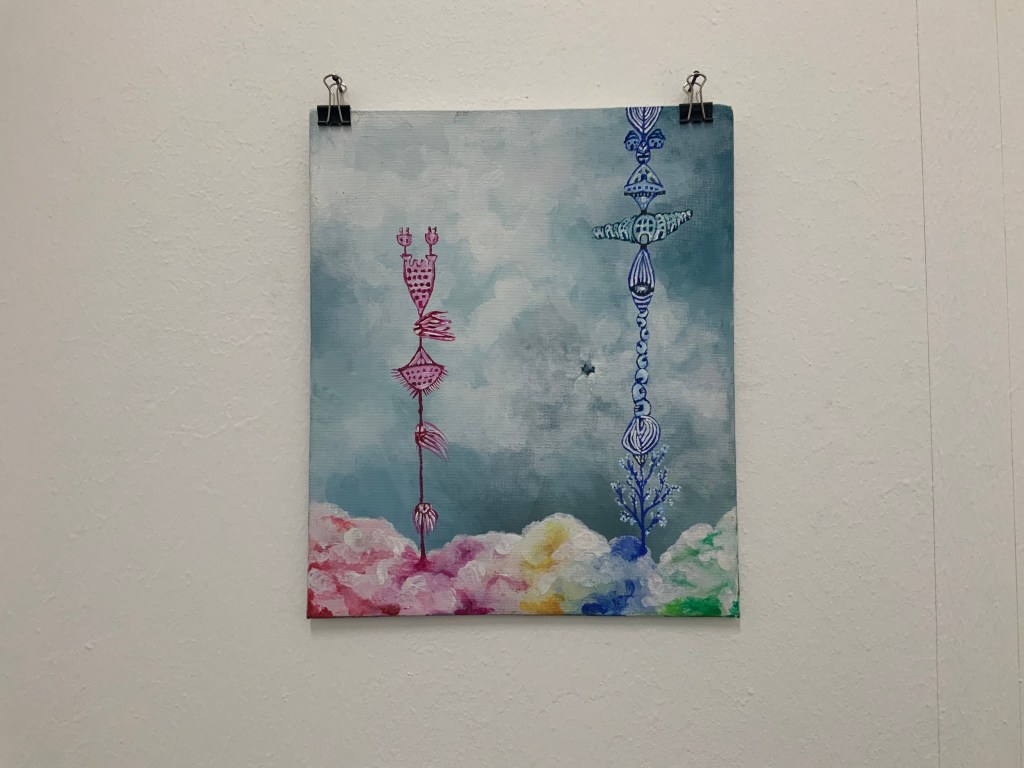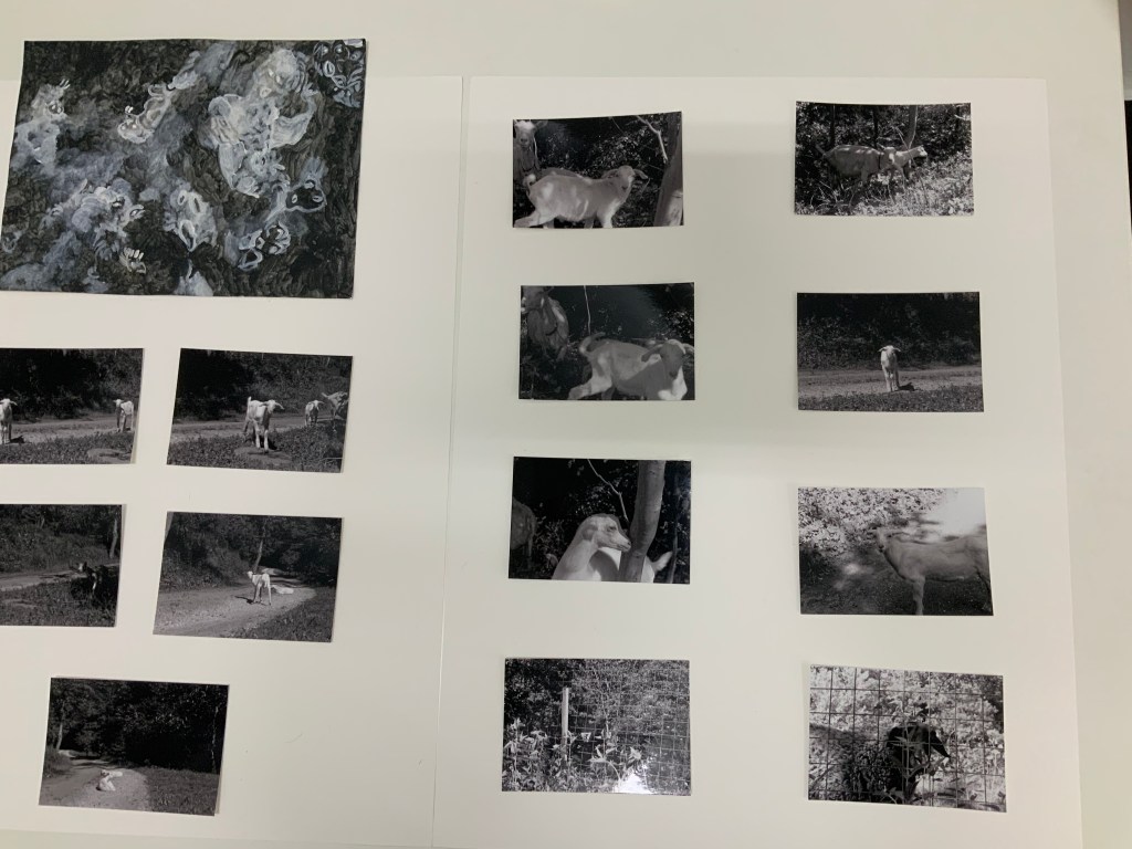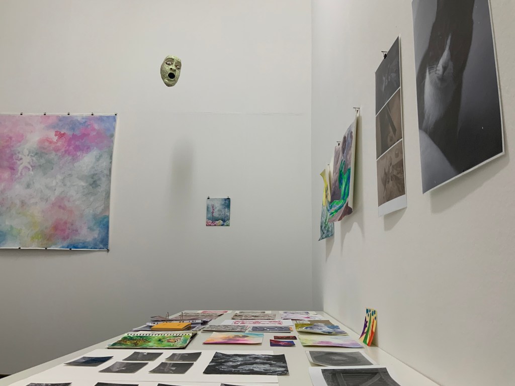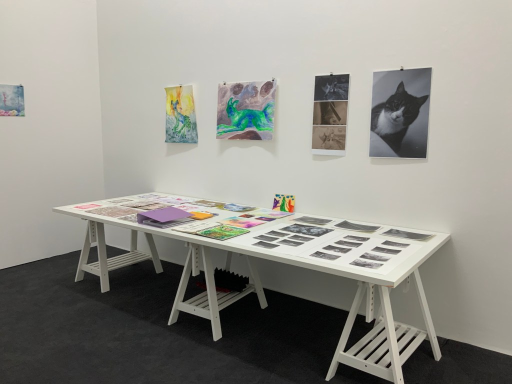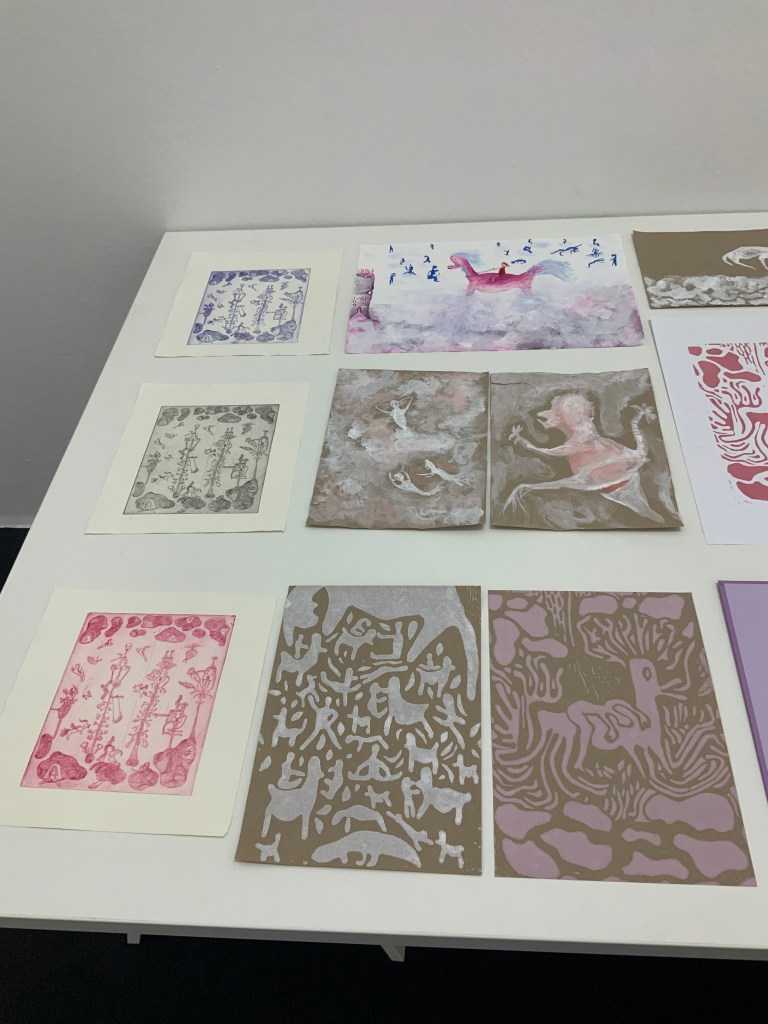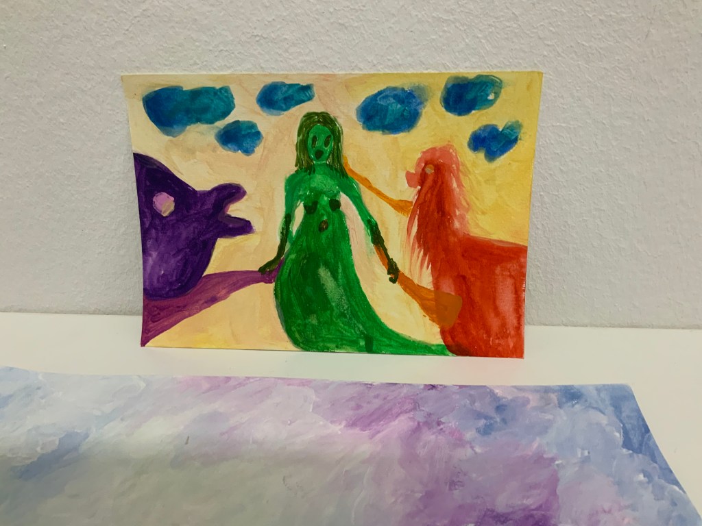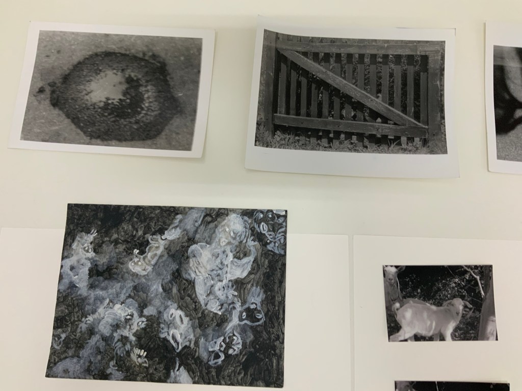 Im weiteren Zusammenspiel mit Sound, der u.a. aus meinem Schreigesang, Wasser- und Windgeräuschen besteht, sowie den Malereien, Grafiken und analogen Fotografien, war es meine Intention in der Arbeit „nach dem Tod wird wieder alles wie früher, oder?“ meine eigene Verletzlichkeit und gleichzeitig die komplexe, mich am Leben erhaltende Tier-, Traum- und Seelenwelt, auszudrücken.