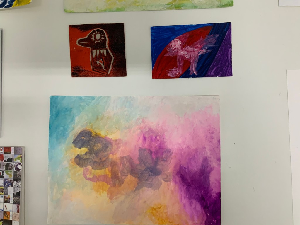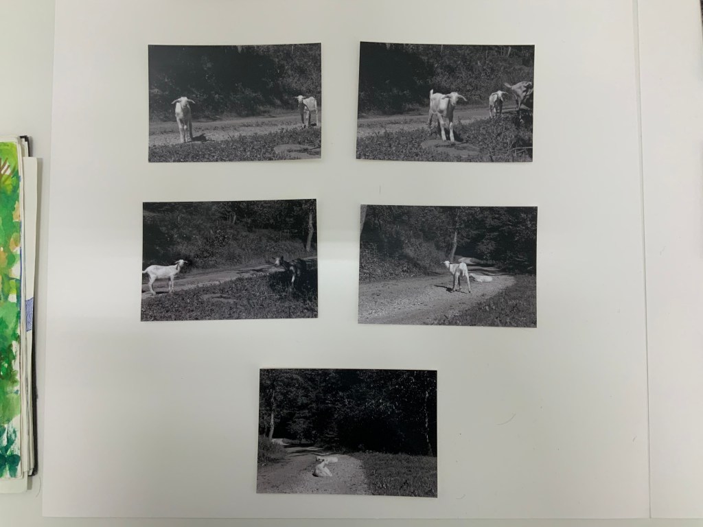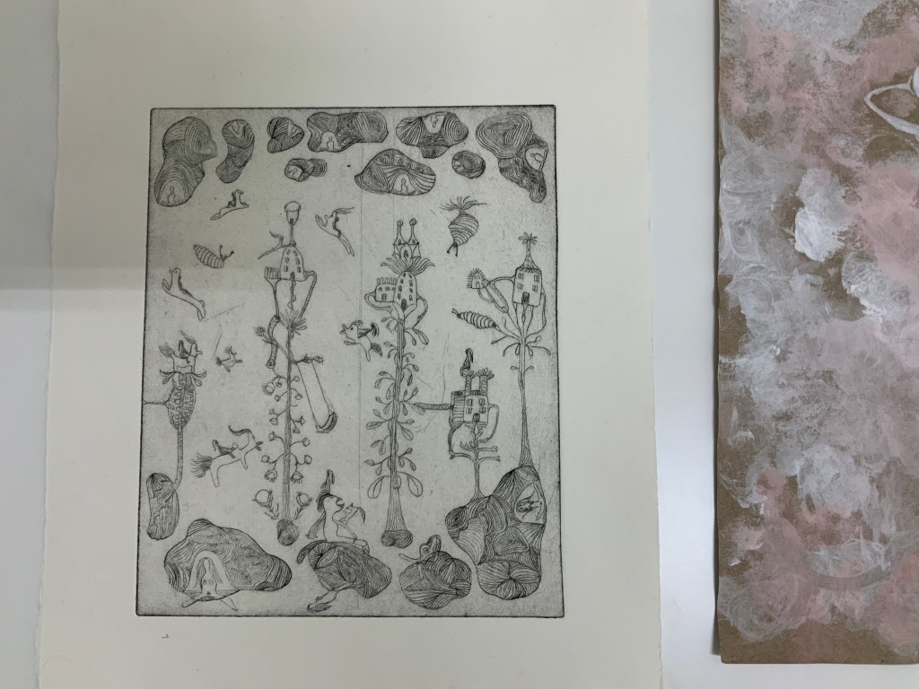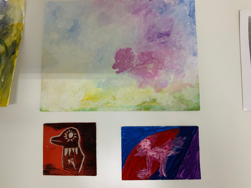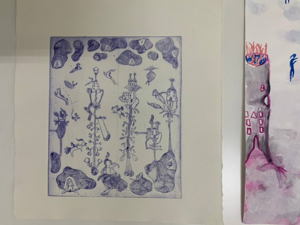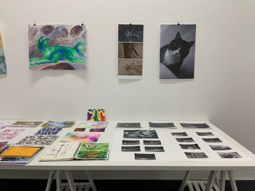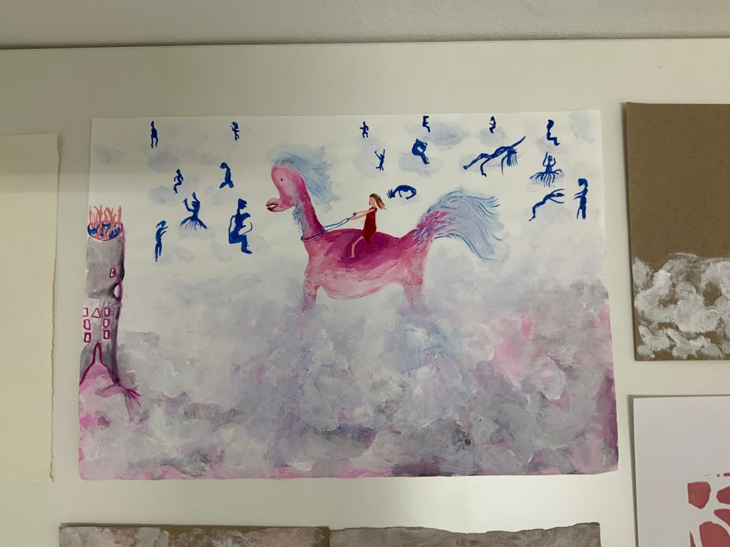 Im weiteren Zusammenspiel mit Sound, der u.a. aus meinem Schreigesang, Wasser- und Windgeräuschen besteht, sowie den Malereien, Grafiken und analogen Fotografien, war es meine Intention in der Arbeit „nach dem Tod wird wieder alles wie früher, oder?“ meine eigene Verletzlichkeit und gleichzeitig die komplexe, mich am Leben erhaltende Tier-, Traum- und Seelenwelt, auszudrücken.