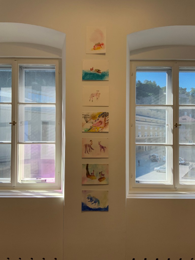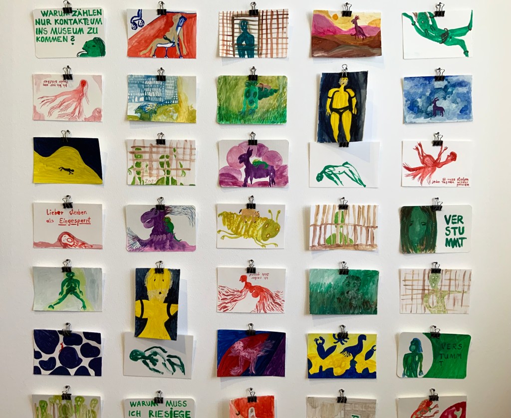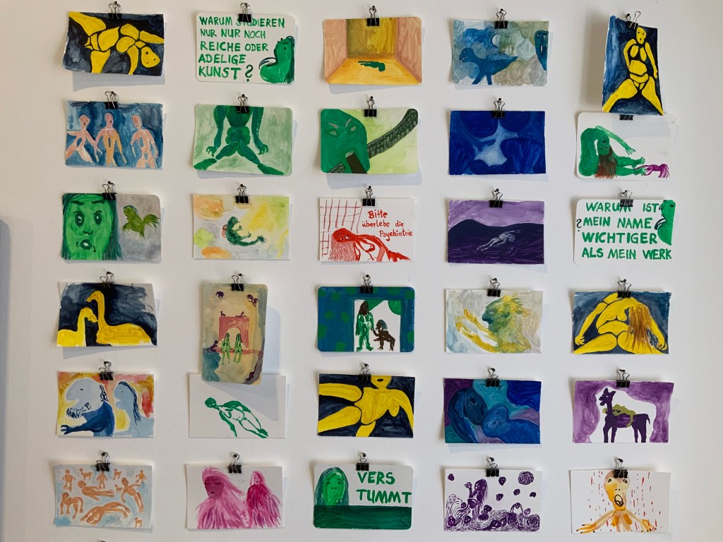 Alterspsychiatrie: Serie von 18 Inkjet-Drucken auf Papier, je 10,5×14,8 cm, auch Teil des Künstlerbuchs „this world is Ego No longer“ (zu verschenken an die Besucherinnen) Eingesperrt, Serie von 75 Aquarellen auf Papier, je 10,5×14,8 cm (zu verschenken an die Besucherinnen)