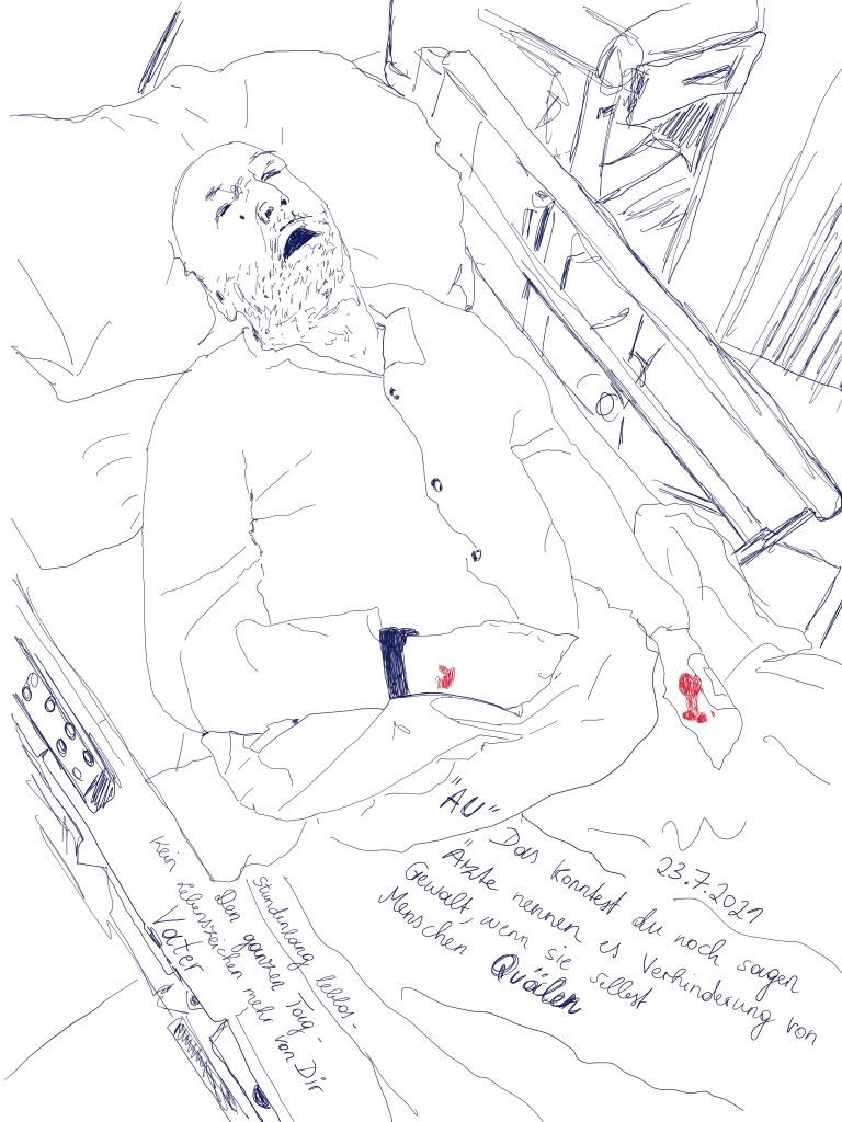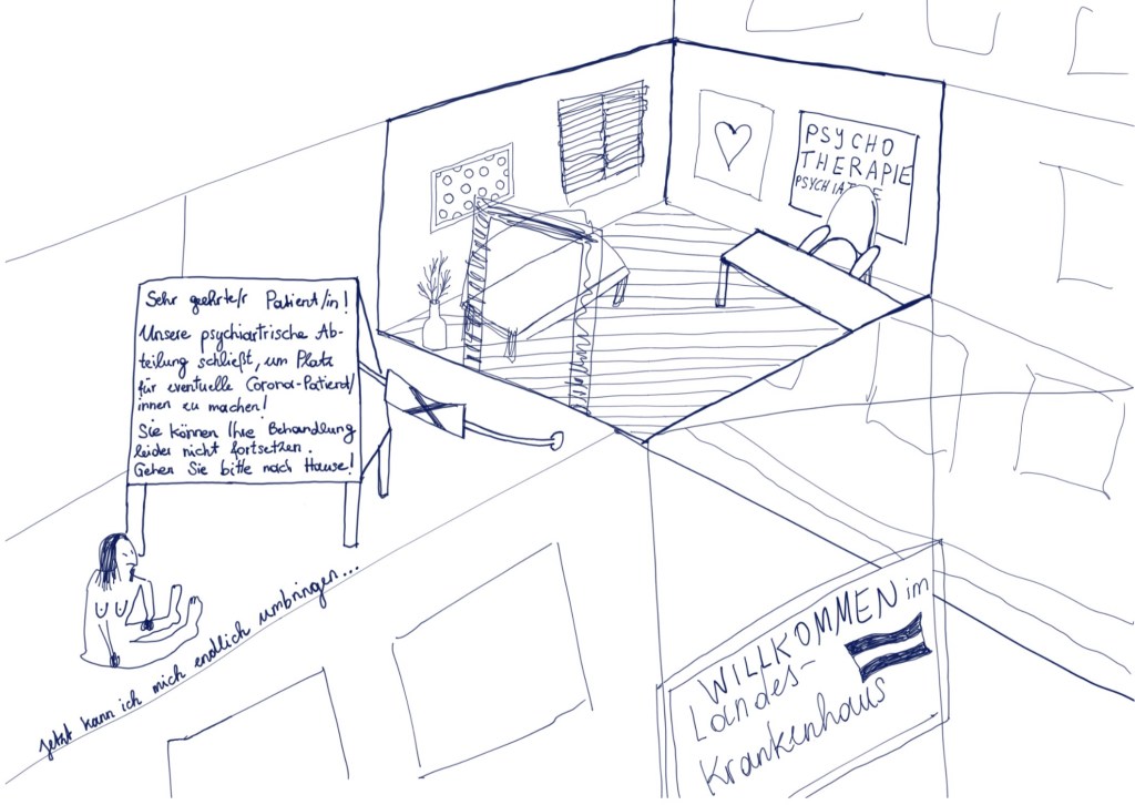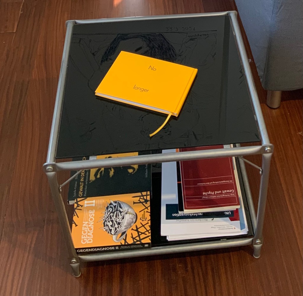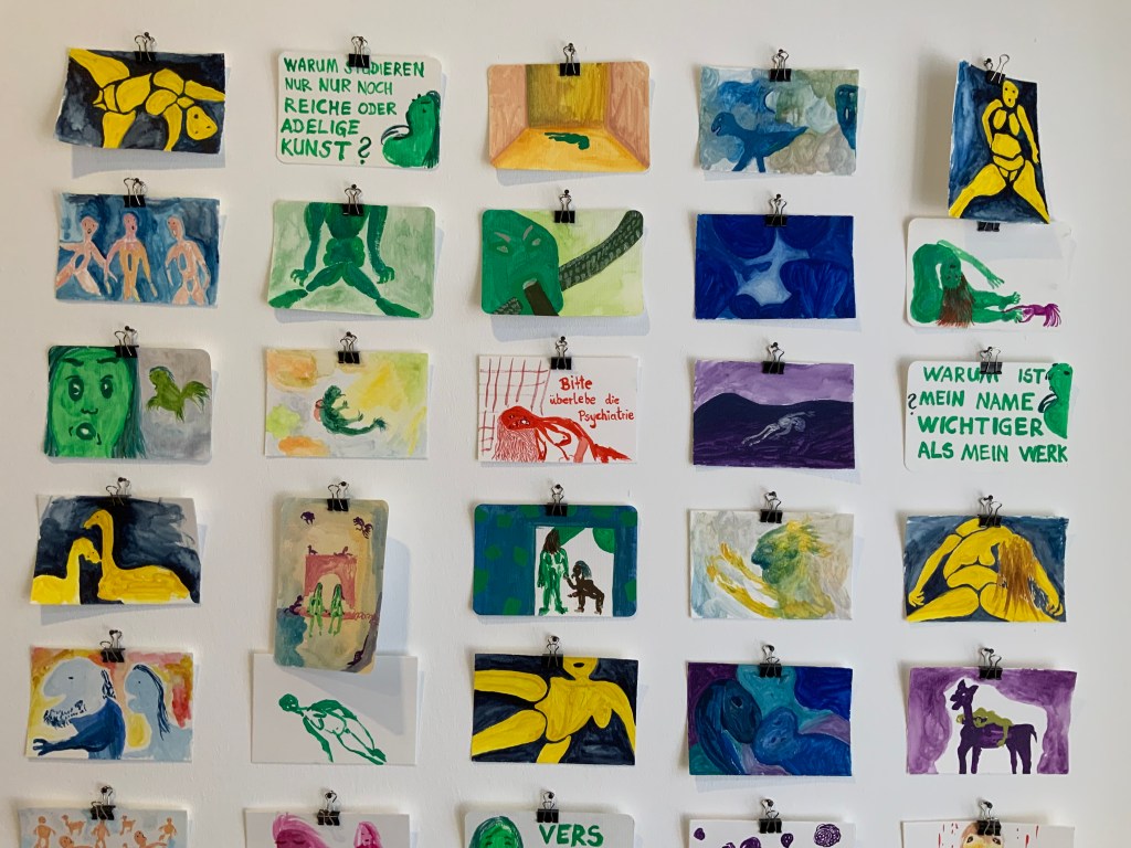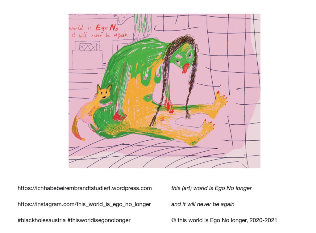 | this world is Ego No longer, Künstlerbuch, 86 Seiten mit digitalen (Comic-) Zeichnungen und Texten. Alterspsychiatrie, Serie von 4 Inkjet-Drucken, je 120×84 cm Alterspsychiatrie, Serie von 18 Inkjet-Drucken, je 10,5×14,8cm (zu verschenken an die Besucherinnen) Eingesperrt, Serie von 75 Aquarellen auf Papier, je 10,5×14,8 cm (zu verschenken an die Besucherinnen) und du liebst mich – Ewiglich, Serie von 7 Aquarellen auf Papier, je 24x32cm Schatten meines Körpers aus Sperrholz, Schaukelstuhl, Sofa, Tisch, Bücher, Tafel, Rahmen, Tafelkreide Diese Website wurde für das Ausstellungsprojekt konzipiert. Sie zeigt weitere Recherchen, Comics und Ausstellungsansichten: www.ichhabebeirembrandtstudiert.wordpress.com Digitale (Comic-)Zeichnungen, variable Größen, die in Form eines Internet-Aktivismus via WordPress, Instagram und Willhaben gezeigt und verteilt wurden. Via WordPress gibt es auch ein Kontaktformular, um Gewalterlebnisse in (Alters-)Psychiatrien zu melden: www.alterspsychiatrie.wordpress.com Mit Instagram und Willhaben wurden die digitalen Comic-Zeichnungen gezeigt und verteilt. Weblinks hierzu: www.instagram.com/this_world_is_ego_no_longer https://www.willhaben.at/iad/kaufen-und-verkaufen/verkaeuferprofil/30624521/ |