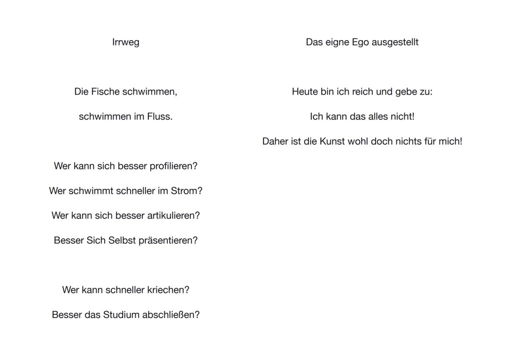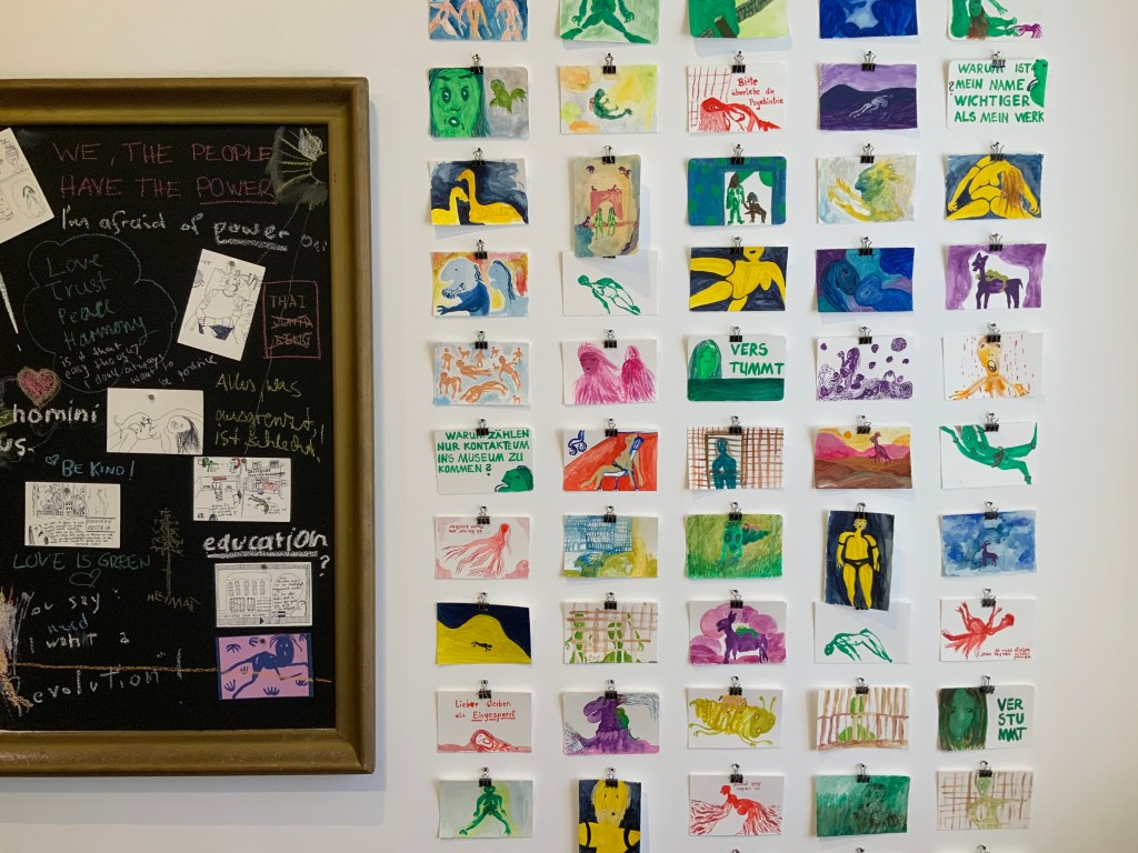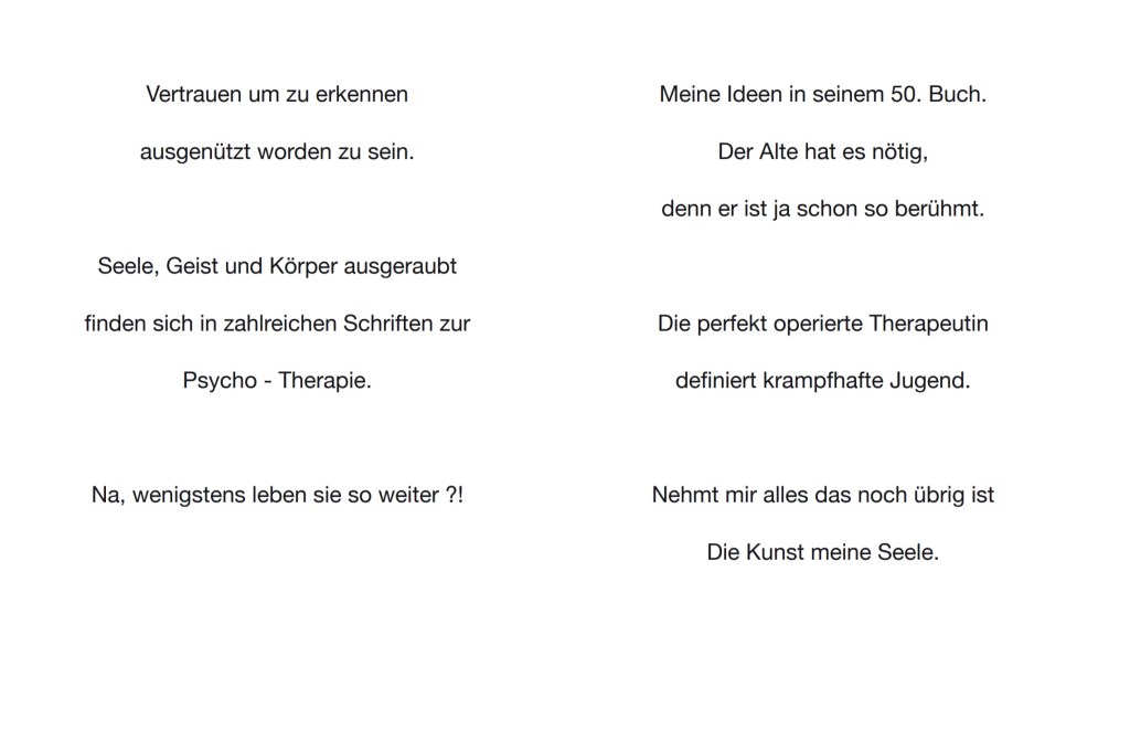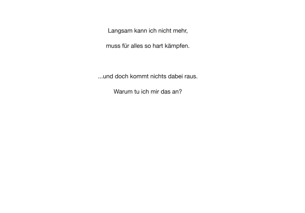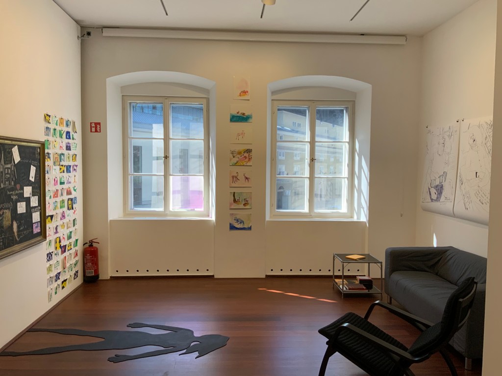 | this world is Ego No longer, Künstlerbuch, 86 Seiten mit digitalen (Comic-) Zeichnungen und Texten. Alterspsychiatrie, Serie von 4 Inkjet-Drucken, je 120×84 cm Alterspsychiatrie, Serie von 18 Inkjet-Drucken, je 10,5×14,8cm (zu verschenken an die Besucherinnen) Eingesperrt, Serie von 75 Aquarellen auf Papier, je 10,5×14,8 cm (zu verschenken an die Besucherinnen) und du liebst mich – Ewiglich, Serie von 7 Aquarellen auf Papier, je 24x32cm Schatten meines Körpers aus Sperrholz, Schaukelstuhl, Sofa, Tisch, Bücher, Tafel, Rahmen, Tafelkreide Diese Website wurde für das Ausstellungsprojekt konzipiert. Sie zeigt weitere Recherchen, Comics und Ausstellungsansichten: www.ichhabebeirembrandtstudiert.wordpress.com Digitale (Comic-)Zeichnungen, variable Größen, die in Form eines Internet-Aktivismus via WordPress, Instagram und Willhaben gezeigt und verteilt wurden. Via WordPress gibt es auch ein Kontaktformular, um Gewalterlebnisse in (Alters-)Psychiatrien zu melden: www.alterspsychiatrie.wordpress.com Mit Instagram und Willhaben wurden die digitalen Comic-Zeichnungen gezeigt und verteilt. Weblinks hierzu: www.instagram.com/this_world_is_ego_no_longer https://www.willhaben.at/iad/kaufen-und-verkaufen/verkaeuferprofil/30624521/ |
