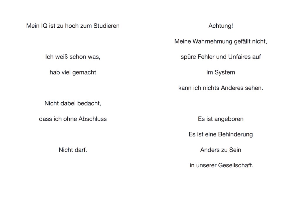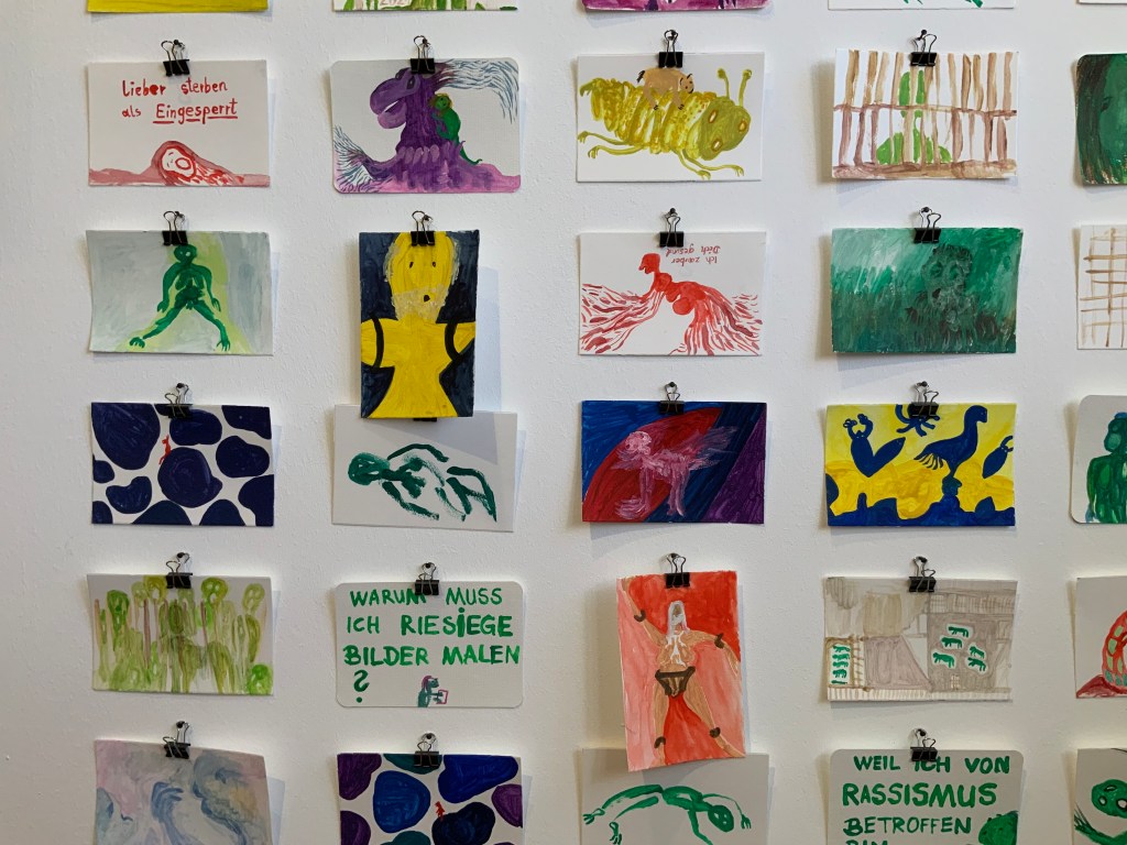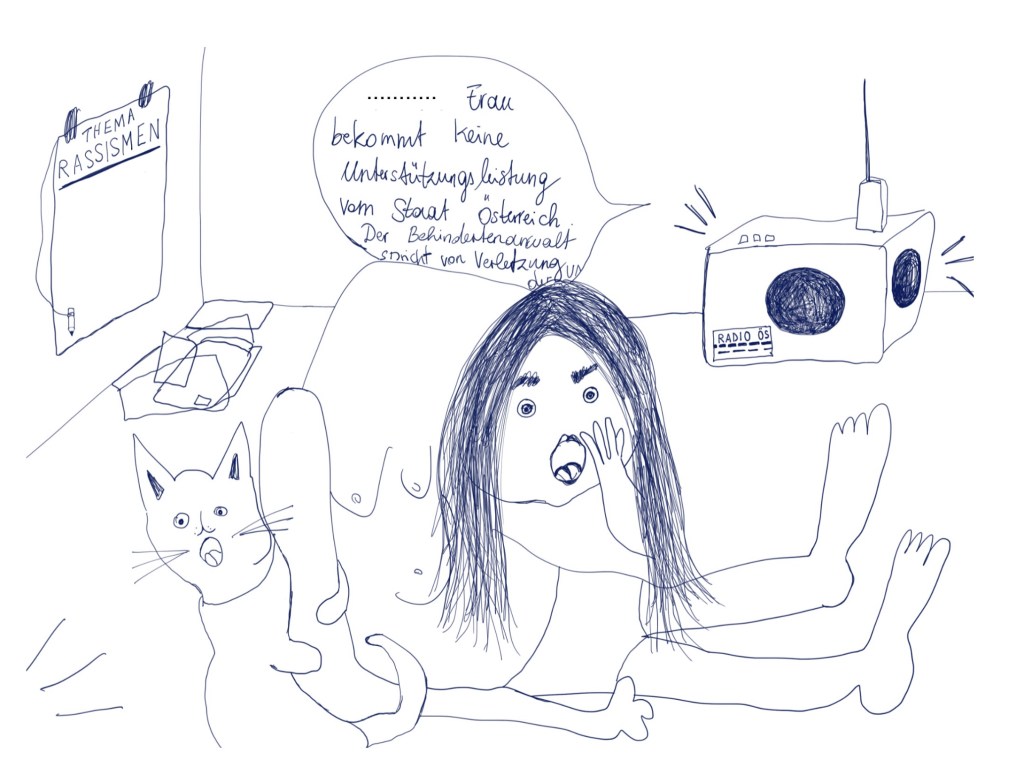 Sie erzählen zum Beispiel von Covid-Folgeerscheinungen, von zugesperrten Krankenhausabteilungen, von tagtäglichen Diskriminierungen an Menschen, die aufgrund von psychiatrisch-medizinisch oder psycho(logisch)-therapeutisch bedingten Stigmatisierungen in unserer Gesellschaft behindert werden. Abgerundet wird die Arbeit von ganz persönlichen, kraftvollen Überlebensstrategien durch Kunst und Liebe zu den Tieren.
