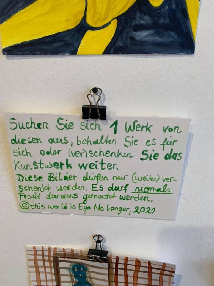 Außerdem können die Besucherinnen so selbst Teil des ganzen Werks werden; sind nicht mehr nur Beobachterinnen im Museum. Auf der Rückseite dieser Bilder ist handschriftlich angebracht, dass die Werke weiter verschenkt werden dürfen, aber niemals verkauft bzw. Profit daraus gemacht werden darf. Es wurden nahezu alle Bilder aus der Ausstellung mitgenommen.