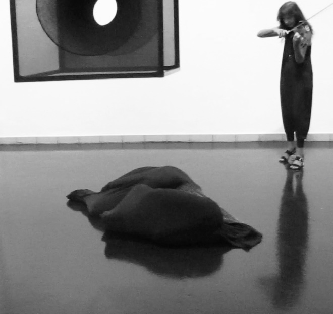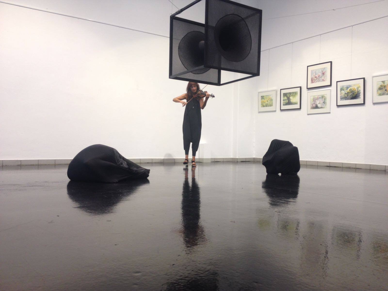 2018, Objekt „Schwarzes Loch“ und Performance „Schwarze Löcher, Todestanz“ (Geige: Andrea Linzer)